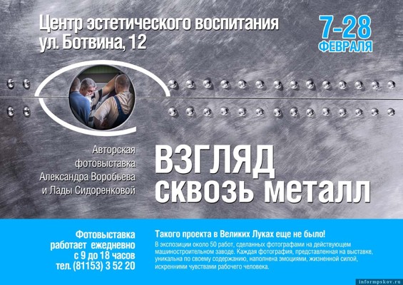 «Взгляд сквозь металл» - необычная фотовыставка. Это творческий проект ЦЭВ, Великолукского машиностроительного завода «ВЕЛМАШ-С», известного великолукского фотографа Александра Воробьева и начинающего фотографа, выпускницы ЦЭВ, студентки Санкт-Петербургского университета технологии и дизайна Лады Сидоренковой.