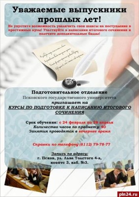 Выпускники школ прошлых лет могут получить дополнительные баллы при поступлении в вуз на написании сочинения. Об этом Псковской Ленте Новостей сообщили в Институте непрерывного образования ПсковГУ. Итоговое сочинение в целях использования его результатов при приеме в образовательные организации высшего образования по желанию могут писать лица, освоившие образовательные программы среднего общего образования в предыдущие годы и имеющие документ об образовании, подтверждающий получение среднего общего образования (или образовательные программы среднего (полного) общего образования – для лиц, получивших документ об образовании, подтверждающий получение среднего (полного) общего образования, до 1 сентября 2013 года), а также граждане, имеющие среднее общее образование, полученное в иностранных образовательных организациях (далее – выпускники прошлых лет). Для выпускников прошлых лет итоговое сочинение может проводиться в первую среду февраля (4 февраля 2015 года) и первую рабочую среду мая (0\6 мая 2015 года). Места регистрации на участие и места проведения итогового сочинения (изложения) для выпускников прошлых лет: г.Псков – МБОУ «Вечерняя (сменная) средняя общеобразовательная школа № 1», ул. 23 июля, д. 13; г.Великие Луки – МБОУ «Центр образования», ул. Половская, д.3; в муниципальных образованиях области - образовательные организации, реализующие программы среднего общего образования. Выпускники прошлых лет при регистрации (подаче заявления) на написание итогового сочинения предъявляют оригиналы документов об образовании. Оригинал иностранного документа об образовании предъявляется с заверенным в установленном порядке переводом с иностранного языка. Указанное заявление подается лично. Сроки подачи заявления на участие в итоговом сочинении (изложении) выпускниками прошлых лет: до 13 апреля на написание 6 мая.