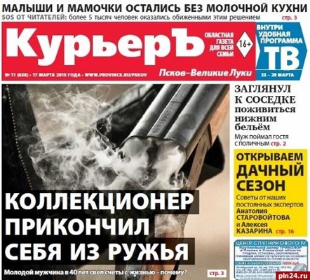 Обзор газеты «КурьерЪ. Псков-Великие Луки», №11 (638), 17.03.2015 г. Читайте и передавайте своим соседям: «Дырка вместо сердца, или Странный самострел коллекционера в Овсищах». В Пскове мужчина свел счеты с жизнью, нажав дома на курок ружья. От автора: об этом ужасном происшествии я узнала поздно вечером в четверг, когда в социальной сети «ВКонтакте» пскович Евгений С. написал: «На улице Ижорского батальона, 45 в Овсищах, на 8 этаже, застрелился коллекционер оружия». 13 марта, я обратилась в Следственный комитет, где подтвердили эту информацию. Подробности происшествия оказались ещё более шокирующими… «Псковичка Татьяна Катющева покорила Америку». Самая сильная девушка из России с красивыми волосами стала чемпионкой турнира, который организовал Арнольд Шварценеггер. Побед такого уровня у нас еще не было. 28-летняя жительница Пскова, мастер спорта России по силовому троеборью Татьяна Катющева заняла первое место и получила почётную чемпионскую статуэтку на престижном международном турнире «Арнольд классик» в городе Каламбус, штат Огайо. На следующий день после возвращения на родину Татьяна дала эксклюзивное интервью «Курьеру». «Нескучный ерш, или Царская рыба». Надо признаться, что не так часто на водоёмах Псковщины встретишь рядом с мужчинами рыболовов-женщин. Ну, а 8 марта такое событие можно было бы расценить как чудо. Представьте, и оно случилось! В праздничный весенний день в Аноховой Губе корреспондент «Курьера» встретил псковичку Наталью Майорову, которая праздничному веселью предпочла совместную рыбалку с мужем. Женщина с успехом ловила «хозяина» наших водоёмов – его величество ерша. «Дачный сезон открыт». Пора сеять зелень и вспомнить все самое важное об удобрениях. Советы дают наши эксперты Анатолий Старовойтов и Алексей Казарин. «Мой Мишка - олимпийский!» Мишин торт, кулинарный опыт молодости, Лену сначала не впечатлил. Чтобы покорить понравившуюся девушку, Михаилу Пасько потребовалось целых 10 лет и должность шеф-повара! От редакции: своих будущих героев мы встречаем в самых неожиданных местах: так, с Еленой и Михаилом познакомились во время последней экспедиции. Как оказалось, ребята ждут рождения малыша, вот и поехали в Рдею, чтобы всё у них было хорошо. «Есть два места, где я черпаю жизненные силы – это остров Белов и Рдея, - признается мне Елена, - а когда ты в таком энергетически сильном месте рядом с любимым – мы счастливы вдвойне!» Ну а дальше я узнала самое интересное… «Малыши и мамочки в остались без творога и кефира». С острой проблемой на прошлой неделе в редакцию обратилась псковичка Ольга. Подобные звонки от малоимущих мамочек продолжались вплоть до дня выхода газеты: «В Пскове в поликлинике на улице Петровской прекратили выдавать малоимущим семьям кефир и творог на молочной кухне. По какой причине наших детей лишили этой льготы, и как долго нам придется жить без этих необходимых продуктов?» «Курьеръ»: первым делом наш корреспондент позвонил в детскую поликлинику №2. «Дорогу в Ваулино убили большегрузы». Тревожный сигнал поступил к нам от Людмилы Николаевны Хитровой, жительницы деревни Великое Село Писковичской волости: «Между деревнями Ваулино и Куповщина есть карьер, из которого возят песок. С этого года рабочие стали выгребать песок ближе к деревне, в результате размесили всю нашу дорогу. По ней теперь 
