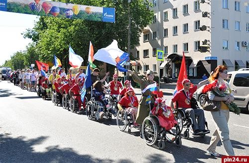 В День России Великие Луки принимали международную эстафету инвалидов–колясочников «Дорога памяти от Москвы до Бреста», посвященную 70-летию Победы над фашистской Германией. Как сообщает портал «Луки.ру», город стал третьим пунктом на пути следования 31 участника марафона, которые несколько дней назад стартовали из Москвы и в течение месяца намерены посетить города России и Белоруссии. На встречу с участниками марафона пришли также инвалиды из местного великолукского отделения общества глухих, которые являются активными участниками многих городских общественных мероприятий. Отметим, что инициатором масштабной международной акции уже 10-й год подряд выступает ассоциация молодых инвалидов России «Аппарель». В рамках визита в Великие Луки члены этой организации, вместе с великолучанами - членами различных городских обществ инвалидов, совершили торжественное шествие по центральному мосту от площади Ленина до Вечного огня. По дороге они пели известные военные песни, дарили горожанам теплые улыбки и хорошее настроение, а в ответ получали приветливые восторженные возгласы пешеходов и автолюбителей. Затем праздничная встреча продолжилась митингом в мемориальной зоне. От имени главы города Николая Козловского участников эстафеты поприветствовал его заместитель Андрей Корнев, который выразил восхищение мужеством, высоким патриотизмом и неравнодушием к судьбе России людей с инвалидностью. «Цель, к которой вы стремитесь, заслуживает глубочайшего уважения. Глядя на вас, убеждаешься, что человеческий дух способен победить любые преграды и трудности, — отметил он. — Вы находитесь на земле, где каждая пядь полита кровью защитников Отечества. Великие Луки — древний исторический город, который в период войны являлся особым стратегическим железнодорожным узлом и имел аэропорт международного значения. Здесь проходили ожесточенные бои, поэтому не случайно в свое время его назвали малым Сталинградом. Подвиг наших защитников всегда будет являться достойным примером преданности своей Родине». Также на митинге выступили президент ассоциации молодых инвалидов России «Аппарель» Николай Будюкин и директор спортивно-культурного сектора всероссийской общественной организации Любовь Юлдашева. Руководители марафона выразили глубокую признательность за теплый радушный прием и вручили благодарственное письмо сотрудникам комитета по молодежной политике и спорту администрации города. «Несмотря на сложности и огромное количество гостей, которые в эти дни посетили Великие Луки, организаторы взяли на себя обязанность принять нас, за что им большое спасибо. Наша международная эстафета — проявление мужества, силы духа и горячее желание людей с ограниченными физическими возможностями видеть мир без границ. Мы не хотим сидеть в четырех стенах и считаем своим долгом низко поклониться солдатам и мирным гражданам, погибшим в Великую Отечественную войну. Каждый из нас стремится созидать, помогать людям, и сегодняшнее мероприятие — хоть и маленький, но значимый вклад в общее патриотическое дело», — отметила Любовь Юлдашева. В память о героях, погибших и без вести пропавших, была объявлена минута молчания, затем присутствующие возложили цветы к Вечному огню. После митинга участники марафона отправились в дом-интернат для престаре