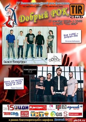 Благотворительный концерт с участием двух петербургских групп состоится в субботу, 17 октября, в псковском клубе «TIR» в рамках благотворительного фестиваля «Добрый рок». Об этом сообщили Псковской Ленте Новостей организаторы мероприятия. В частности, перед жителями города будут выступать группы «Адрес» и «Режим ожидания». Вход с 19.00, начало концерта - в 20.00. Вход на концерт - пожертвование от 150 рублей. Напомним, все сборы с концертов «Доброго рока» идут на реализацию программы помощи детям, нуждающимся в дорогостоящем лечении «Я хочу жить».