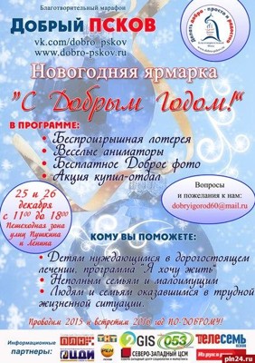 25 и 26 декабря в рамках Новогодней ярмарки в пешеходной зоне улиц Пушкина и Ленина в Пскове будет работать точка «Доброго Пскова». Как сообщили Псковской Ленте Новостей организаторы, с 11.00 до 18.00 будут организованы беспроигрышная новогодняя лотерея и акция «Купил-отдал». Кроме того, будут работать веселые аниматоры с бесплатным «Добрым фото». Все собранные средства и подарки будут переданы детям, нуждающимся в дорогостоящем лечении, неполным малоимущим семьям, людям и семьям, попавшим в трудную жизненную ситуацию. «Добрый Псков» приглашает к сотрудничеству волонтеров, аниматоров и предпринимателей. Подробную информацию можно получить по телефону 8-963-336-35-26, dobryigorod60@mail.ru.