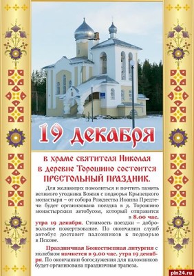 19 декабря Русская Православная Церковь отмечает День святителя Николая Чудотворца. Святитель Николай считается покровителем путешественников и мореплавателей. И является одним из самых почитаемых святых в православном мире. Святитель Николай, живший в 3-4 веках, прославился как великий угодник Божий, поэтому в народе его обычно называют Николаем Угодником. Святитель Николай считался «всех предстателем и заступником, всех скорбных утешителем, всех сущих в бедах прибежищем, благочестия столпом, верных поборником». 19 декабря состоится престольный праздник храма святителя Николая деревни Торошино Псковского района. Праздничный молебен святителю Николаю будет служиться с крестным ходом вокруг храма с кроплением святой водой. Торжество окончится праздничной постной трапезой для всех желающих гостей, жителей и паломников храма Святителя Николая Чудотворца. 20 декабря, в воскресенье, в 11.00, в храме Николая Чудотворца и Сергия Радонежского в деревне Заклюка в Локнянском районе состоится Божественная литургия (исповедь, причастие). После службы - Крестный ход. Напомним, церковь во имя святителя Николая Чудотворца вошла в число победителей конкурса «15 чудес Псковщины». Храм был построен в 1767 году на средства великолучанина полковника Федора Пущина. Знаменательным событием этой церкви стало венчание в ней в 1778 году ученика Суворова, участника штурма Измаила Михаила Кутузова с Екатериной Бибиковой. Церковь Святителя Николая Чудотворца находится в 14 километрах от Локни к югу. Уже несколько лет церковь пытаются восстановить силами неравнодушных прихожан.