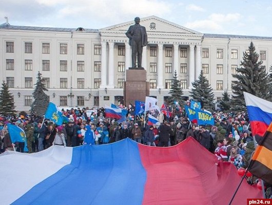 Мороз, солнце, пронизывающий насквозь ветер, псковичи, нескончаемым потоком стекающиеся к площади Ленина... Здесь сегодня состоялся митинг-концерт «Мы вместе!» в честь второй годовщины возвращения Крыма в состав России. 16 марта 2014 года в Крыму и Севастополе состоялся референдум, 90% участников которого проголосовали за выход этих регионов из состава Украины и воссоединение с Россией. Через два дня после голосования, 18 марта, в Кремле был подписан договор о вхождении Крыма и Севастополя в состав России. Крым получил статус республики, а Севастополь - статус города федерального значения. Еще издали, с Ольгинского моста, хорошо просматривались флаги партий, общественных движений и, конечно же, государственные флаги России. Сильный ветер выгодно подчеркивал их многоцветие. Неожиданно было на подходе к площади услышать «Moscow Calling» группы Gorky Park, однако потом она сменилась на более логичные для предстоящего мероприятия патриотические песни. Доминантой на митинге по традиции стал огромный российский триколор, развернутый между сценой и памятником Ленина. На митинг собрались более 3 тысяч человек. Помимо Пскова, были представлены делегации из Великих Лук, Псковского, Печорского, Палкинского, Островского, Пушкиногорского районов. К слову, организаторы - Псковское региональное отделение Российского военно-исторического общества и Псковское региональное отделение «Союза женщин России» - ожидали, что на митинг придет в районе 2,5 тысяч человек. Сегодня на площадь пришли представители партий «Единая Россия», ЛДПР и «Справедливая Россия», члены ОНФ, общественных движений, представители профсоюзов, студенческая молодежь, простые граждане, которые считают воссоединение Крыма с Россией важным историческим событием. К митингу присоединились даже псковские мотоциклисты. Они красиво въехали на площадь на своих «железных конях» и сразу же стали предметом внимания девушек. На митинг пришел и губернатор Псковской области Андрей Турчак. Он счел необходимым прийти на площадь, чтобы разделить с псковичами радость по поводу воссоединения Крыма с Россией, но не выступал с громкими речами. Однако затеряться в толпе ему не удалось - многие студенты выстраивались в очереди, чтобы сфотографироваться с губернатором. Вместе с ним на митинге можно было увидеть его первого заместителя Веру Емельянову, вице-губернатора Максима Жаворонкова, заместителя руководителя аппарата администрации региона Романа Романова, председателя Псковского областного Собрания Александра Котова, вице-спикера Виктора Остренко, депутатов Псковского областного Собрания и Псковской городской Думы и многих других. Многие пришли на площадь с плакатами «Мы вместе», «Крым в моем сердце», «Россия + Крым = единство». Открыл мероприятие председатель регионального отделения Российского военно-исторического общества Александр Голышев. Охрипшим то ли от волнения, то ли от простуды голосом, он отметил, что «сегодня поистине великий день - исправлена историческая ошибка, и Крым вернулся в состав России». «Крым стал для нас испытанием, но теперь он всегда будет с нами. Это торжество русской культуры, русского духа и военной славы России», - сказал Александр Голышев. Председатель регионального отделения «Союза женщин России» Наталья Никифорова назвала присоединение Крыма к России «з