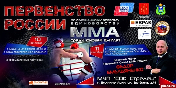Впервые в истории смешанного боевого единоборства (ММА) в России официальное спортивное мероприятие – первенство России среди юношей 16-17 лет (1999 – 2000 г.р.), состоится с 9 по 12 сентября в городе. Великие Луки в спортивно-оздоровительном комплексе «Стрелец». Как сообщили Псковской Ленте Новостей в Государственном комитете Псковской области по физической культуре и спорту, данное соревнование будет отборочным на участие в первом первенстве мира по ММА, которое пройдет с 18 по 20 ноября в Макао (Китай). Право провести данное мероприятие было предоставлено Псковской областной Федерации ММА неслучайно - в Псковской области этот вид спорта развивается довольно успешно, за последние два года открыто два специализированных клуба «Центр ММА» в г. Великие Луки и в г. Пскове, благодаря грантовой поддержке администрации области. Два года подряд псковский спортсмен Руслан Шамилов становился бронзовым призером чемпионатов России, ряд спортсменов ежегодно приносят в копилку сборной золотые медали окружных соревнований. На мероприятие ожидается приезд многократного чемпиона мира по боевому самбо и ММА, президента ООО «Союз ММА России» Федора Емельяненко. В финальный день соревнований кроме поединков за первое место пройдут профессиональные бои среди мужчин и один бой среди женщин в рамках промоушен «T-Rex». Программа соревнований (МУП «СОК Стрелец», по адресу: Псковская область, г. Великие Луки, ул. Ботвина, 4): 9 сентября – приезд команд, взвешивание и прохождение мандатной комиссии. 14:00 – 19:00 – взвешивание и мандатная комиссия. 19:15 – проведение собрания представителей и руководителей команд, жеребьевка. 10 сентября 10:00 – начало соревнований; 13:00 – 13:30 – торжественное открытие соревнований; 13:30 – предварительные и полуфинальные поединки. 11 сентября 14:00 –финальные поединки и профессиональные бои; 17:00 – командное награждение. 12 сентября До 12:00 – отъезд команд.