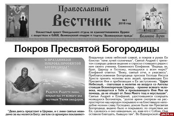 15 октября, по благословению епископа Великолукского и Невельского Сергия, в составе городской газеты «Великолукская правда» вышел в свет первый выпуск специального православного приложения (вкладки) «Православный вестник - Великие Луки». Как сообщили Псковской Ленте Новостей в епархии, ежемесячное приложение «Православный вестник» - совместный проект Синодального отдела по взаимоотношениям Церкви с обществом и СМИ Московского Патриархата, Информационно-аналитического отдела Великолукской епархии и городской газеты «Великолукская правда». Его задача - в доступной форме познакомить читателей с жизнью Церкви. Приложение освещает наиболее актуальные общецерковные и епархиальные события, а также содержит ответы на часто задаваемые вопросы о православии, рассказы об истории Церкви и т.д. В настоящий момент в проекте «Православный вестник» принимают участие издания из 15 регионов. Общий тираж изданий-участников составляет около 80 000 экземпляров. В их числе - газеты из Иркутска, Самары, Красноярского края, Московской, Ленинградской, Челябинской, Ивановской, Псковской и Воронежской областей.