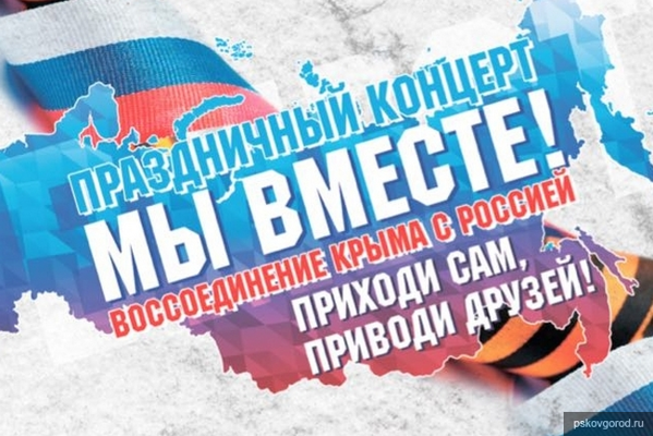 Напомним, 18 марта в Пскове состоятся праздничные гуляния «Мы вместе!» в честь воссоединения Крыма с Россией, сообщили Псковскому агентству информации в пресс-службе муниципалитета.