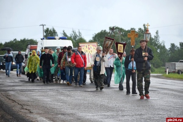 Вечером 13 июня международный пеший православный крестный ход, приуроченный к 100-летию начала подвигов новомучеников Церкви Русской, прибыл в Великие Луки. Как сообщили Псковской Ленте Новостей в Великолукской епархии, на входе в город, у АЗС «Статойл», участников крестного хода приветствовал секретарь Великолукского Епархиального управления иеромонах Нил (Лосев), прихожане великолукских храмов и местные жители. После непродолжительного отдыха крестный ход проследовал по Октябрьскому проспекту к храму Казанской иконы Божией Матери, где состоялся молебен, который возглавил настоятель Казанского храма протоиерей Александр Яковлев. 14 июня, в день памяти святого праведного Иоанна Кронштадтского, участники международного пешего православного крестного хода молились в Свято-Тихоновском соборе города Великие Луки. За Божественной литургией многие из участников крестного хода исповедовались и причастились Святых Христовых Таин. Богослужение возглавил клирик Свято-Тихоновского собора города Великие Луки протоиерей Димитрий Соловьев. По окончании Литургии протоиерей Димитрий обратился к верующим со словами проповеди, а также поприветствовал участников крестного хода, пожелал им помощи Божией и поздравил всех собравшихся с праздником. Предполагается, что 15 июня, после молебна о путешествующих в Свято-Тихоновском соборе г. Великие Луки, который начнется в 5.30, крестоходцы продолжат движение в сторону Локни. Напомним, что международный пеший православный крестный ход, посвященный 100-летию начала подвигов новомучеников Церкви Русской вышел из Могилева 27 мая, по благословению Святейшего Патриарха Московского и всея Руси Кирилла. Руководитель крестного хода Андрей Бардиж. По благословению епископа Великолукского и Невельского Сергия, участников крестного хода на всей территории Великолукской епархии сопровождает настоятель храма Казанской иконы Божией Матери с. Глубокое иерей Михаил Петров. Крестный ход организован по инициативе православных мирян, пожелавших пройти с соборной молитвой по пути, где 100 лет назад началась Русская Голгофа. Крестоходцам из Белоруссии, России и Украины предстоит пройти более 500 км по маршруту: Могилев-Витебск-Великие Луки-Псков, постоянно соборно совершая в пути Иисусову молитву и регулярные молебны на остановках. На сегодняшний день пройдено более 300 км. Все время пути, во главе крестного хода, участники несут крест с частицей мощей святителя Тихона, Патриарха Всероссийского, хоругви, древнюю икону святителя Николая с частицей мощей святого и большую икону «Святых царственных страстотерпцев», написанную специально для этого шествия. Ориентировочные даты прибытия крестного хода в населенные пункты Великолукской епархии: Бор - 15 июня, Башово - 16 июня, Локня - 17-19 июня, Бежаницы - 20 июня, Ашево - 21 июня. Предполагается, что вечером 22 июня участники крестного хода достигнут д. Сорокино Дедовичского района и окажутся на территории Псковской епархии. Даты прибытия крестного хода в населенные пункты Псковской епархии: Сорокино - 22 июня, Дедовичи - 23-25 июня, Выскодь - 26 июня, Дно - 27-28 июня, Порхов - 29 июня, Никандрова пустынь - 30 июня - 2 июля, Б.Загорье - 3 июля, Лопатово - 4 июля, Псков - 5 июля.