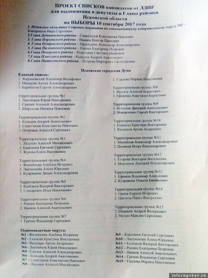 Отметим, в партийных списках по округам и списке одномандатников присутствуют фамилии кандидатов на выборы глав муниципалитетов. При этом бывший областной координатор ЛДПР и экс-депутат областного парламента, экс-кандидат на выборах губернатора и главы Псковского района, а нынче руководитель регионального оператора — Фонда капитального ремонта общего имущества в многоквартирных домах Псковской области Сергей Макарченко занимает лишь 2-ю строчку в партийном списке по 9-му округу.