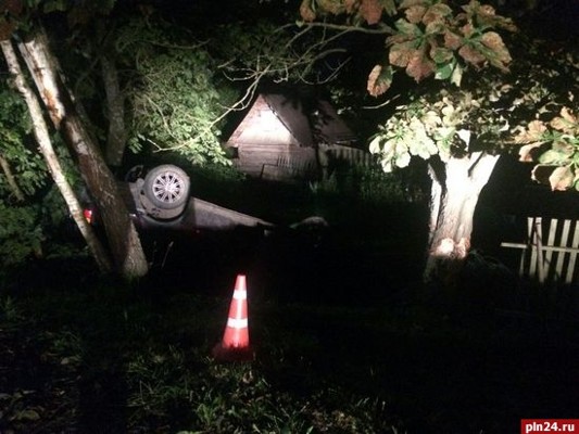 «Фольксваген» под управлением автоледи опрокинулся во дворе частного дома в Великолукском районе, пострадали два человека