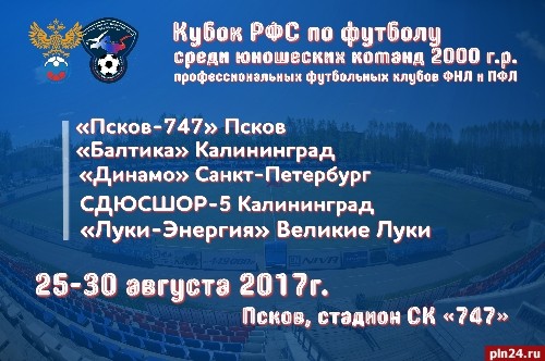 В Пскове с 25 по 30 августа пройдет предварительный этап Кубка Российского футбольного союза среди юношеских команд профессиональных футбольных клубов ФНЛ и ПФЛ U-18. Как сообщили Псковской Ленте Новостей организаторы, участвуют команды, составленные из футболистов 2000 года рождения и моложе. За путевку на финальный турнир будут бороться пять команд: «Псков-747», «Балтика» Калининград, «Динамо» Санкт-Петербург, СДЮСШОР-5 Калининград и «Луки-Энергия» Великие Луки. По регламенту соревнования проводятся среди юношеских команд профессиональных футбольных клубов ФНЛ и ПФЛ, команд футбольных центров, а также команд ДЮСШ, не относящихся к профессиональным футбольным клубам РФПЛ. Предварительный календарь игр: 25 августа (пятница) 09.00 «Луки-Энергия» Великие Луки – «Балтика» Калининград 14.45 торжественное открытие турнира 15.00 «Псков-747» Псков – «Динамо» Санкт-Петербург 26 августа (суббота) 09.00 «Балтика» Калининград – СДЮСШОР-5 Калининград 15.00 «Динамо» Санкт-Петербург – «Луки-Энергия» Великие Луки 27 августа (воскресенье) 09.00 СДЮСШОР-5 Калининград – «Луки-Энергия» Великие Луки 15.00 «Балтика» Калининград – «Псков-747» Псков 28 августа (понедельник) выходной день 29 августа (вторник) 09.00 СДЮСШОР-5 Калининград – «Динамо» Санкт-Петербург 15.00 «Луки-Энергия» Великие Луки – «Псков-747» Псков 30 августа (среда) 09.00 «Динамо» Санкт-Петербург – «Балтика» Калининград 11.00 «Псков-747» Псков – СДЮСШОР-5 Калининград 13.00 торжественное закрытие турнира.