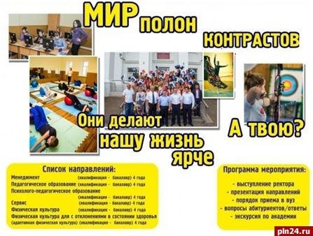 Великолукская государственная академия физической культуры и проводит День открытых дверей. Как сообщили Псковской Ленте Новостей организаторы, в программе мероприятия - выступление ректора, презентация направлений подготовки, особенности приема абитуриентов в вуз в 2018 году на очное и заочное обучение, экскурсия по академии и посещение музея. Приглашаются выпускники школ, родители и все желающие. День открытых дверей состоит 1 ноября 2017 года в 14:00 часов по адресу: Великие Луки, площадь Юбилейная 4, актовый зал главного корпуса академии.