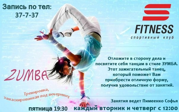 Спортивный клуб «С-Фитнес» всегда рад открывать для вас новые горизонты. Шестого сентября, уже завтра, у нас в клубе стартует новое направление — зумба! Тренер: Софья Пимеенко.