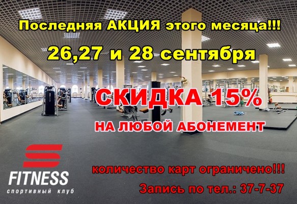 Не упусти свой шанс приобрести любую клубную карту со скидкой 15%. Занимайся вместе с «С-Фитнес» выгодно.