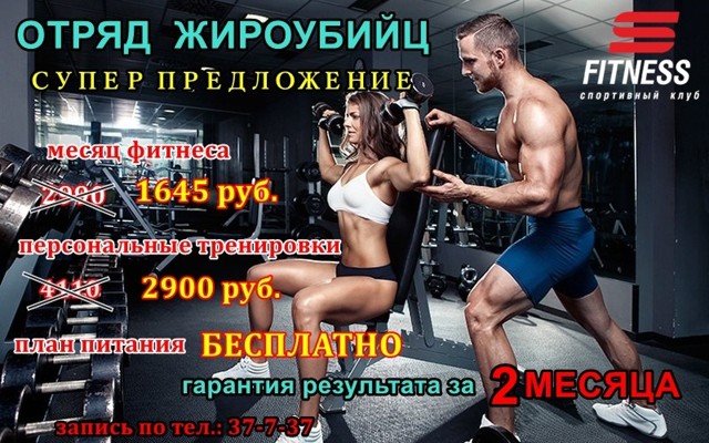 Супер предложение от спортивного клуба «С-фитнес» набор участников в «Отряд жироубийц» идет полным ходом. Не упусти и ты свой шанс. Осталось всего несколько мест.