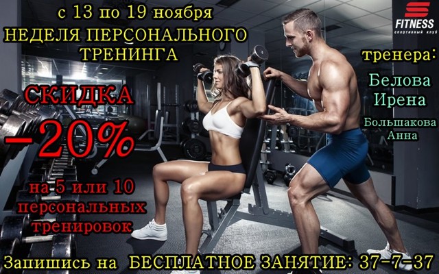 С 13 по 19 ноября объявляется неделя персонального тренинга под руководством Большаковой Анны и Беловой Ирены. Запишись на персональную тренировку к Анне или Ирене совершенно бесплатно.