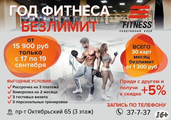 С 17 по 19 сентября получи наш главный подарок — год безлимитного фитнеса от 1 300 рублей в месяц вместо 2 990 рублей.
