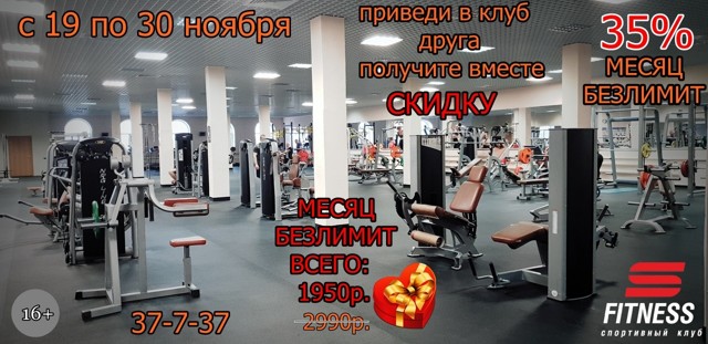 С 19 до 30 ноября спортивный клуб «С-фитнес» проводит выгодную акцию: тем, кто приведут друзей в спортивный клуб, получат скидку 35% на месяц безлимитного фитнеса!