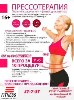 С 5 по 30 октября в клубе «S-fitness» действуют выгодные цены на сеансы прессотерапии (16+)