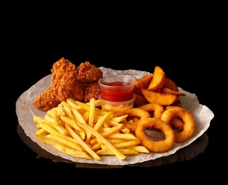 Куриные стрипсы, Сырные палочки, Кольца кальмара, Картофель фри, Слайсы ржаные, соусы (чесночный, ремулад, спайси)