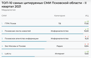 Луки.ру вошли в топ-5 самых цитируемых СМИ Псковской области во II квартале 2021 года. Индекс цитируемости вырос на 3 пункта и составил 6,82, сообщает компания «Медиалогия», которая специализируется на рейтингах медиаресурсов.
