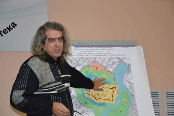 Вниманию присутствующих была представлена карта-схема реализации концепции музеефикации объекта культурного наследия федерального значения «Земляной вал. Крепость». Наталья Леонидовна Сергеева рассказала о полномочиях комитета культуры в сфере охраны объектов культурного наследия, о его планах по тем направлениям деятельности, которые определены российским законодательством в сфере охраны объектов культурного наследия. Сразу же оговорила, что работа с объектом культурного наследия «Великолукская крепость» многоплановая. Так как законодательством определено формирование определённого пакета документов по любому объекту культурного наследия, то и Великолукская крепость должна иметь паспорт на культурное наследие.