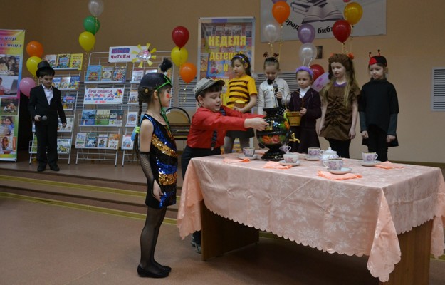 Весёлая музыка, чтение стихов и постановка сценок из художественных произведений детских писателей-классиков первоклассниками гимназии им. С. В. Ковалевской и учащимися школы №9 - всё это стало похожим на игровую сказку. Казалось, что даже поделки ребят - «царевна-лягушка», «русалочка», «рыба-кит» увлечённо наблюдали за происходящим с мест, где их разместили. Они по-сказочному завидовали Мухе-Цокотухе, Комару и всем таракашкам из сказки Корнея Чуковского «Муха-цокотуха», которые появились среди ребят. Разумеется, это были переодетые в сказочных героев мальчики и девочки. Эти ребята, представляя сценку из сказки, здорово расположили к себе гостей праздника.