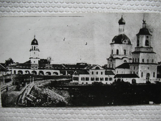 2. Вторая половина 19-го века. Церковь Спаса-Преображения. Находилась на северной оконечности острова Дятлинка и называлась в обиходе просто «Спас». Имела «достопримечательность» - наклонную колокольню, чем великолучане немало гордились. Построена в 1733 году на месте прежнего деревянного храма Стрелецкой слободы. Снято с левого берега реки от подножия крепостного вала. На заднем плане дома часовня святой Екатерины (в настоящее время восстановлена) на Екатерининской (ныне Пушкинской) улице.