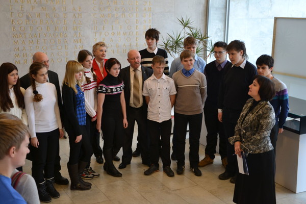 3 декабря в краеведческом музее прошла встреча участников нашей делегации с активом студенческого совета и учащимися школы № 2. Приглашая к разговору, директор музея Т. П. Случаева обратила внимание, что грамота, выставленная у них в экспозиции, является подлинной, именно той, что из рук Президента страны принимали мэр Л. Г. Голубева, ветеран Великой Отечественной войны М. В. Хайлов и кадет Илья Антонов.