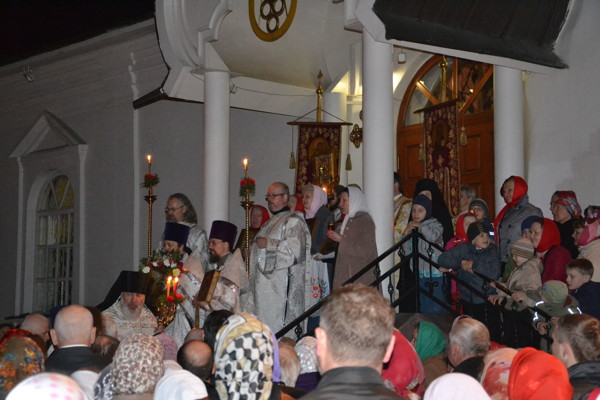 Почти в полночь из Собора Вознесения Христова вышел Крестный ход, возглавляемый благочинным Великолукского округа, настоятелем этого храма игуменом Савватием (Донченко) и сослужившими ему в ту ночь священниками и диаконами, а также соборным хором. С зажженными свечами и лампадами спешили за своими пастырями миряне, чтобы, как сказал в Пасхальном послании правящий Архиерей – Высокопреосвященнейший Митрополит Псковский и Великолукский Евсевий, услаждая душу церковным пением и наполняя дивным созерцанием церковных стихир и канонов, постараться просветиться Торжеством Христова Воскресения, просиять светом и радостью праздника и наполнить наши сердца Божией, небесной, пламенеющей любовью к Богу и людям, чтобы в нем не было места вражде, памято-