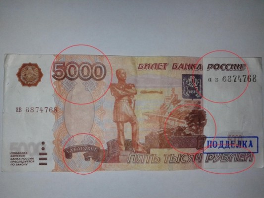 Фальшивые купюры достоинством 5000 и 1000 рублей обнаружились при пересчёте выручки в Вакобанке и одном из филиалов Сбербанка. Обе бумажки – с явно выраженными признаками подделки.