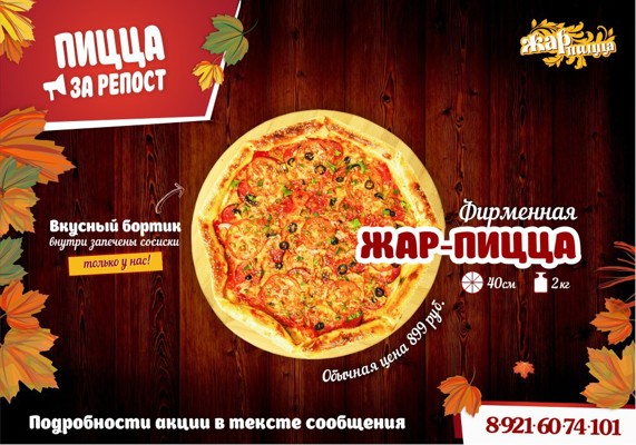 Осень вступает в свои права, время согреваться горячей пиццей! «Жар-пицца» объявляет новый розыгрыш! Приз — наша фирменная «Жар-пицца» со сказочным обилием начинки: до самых краёв и даже больше! Внутри бортиков запечены сочные сосиски. Такая пицца только у нас.